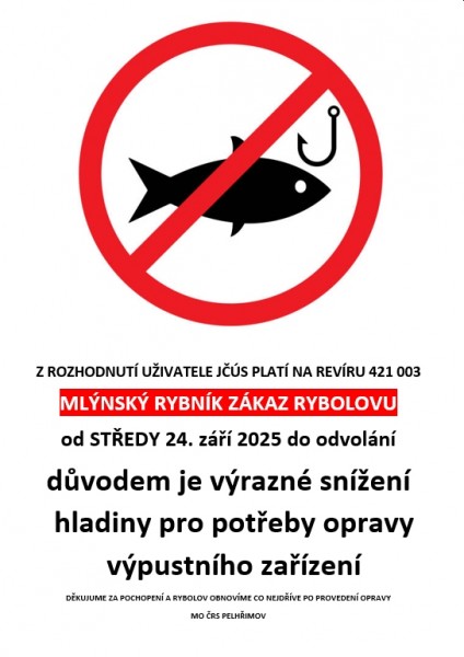 Platnost zákazu je od pondělí 8. června 2015 do odvolání. Důvodem zákazu je chystané vypuštění rybníka a následná realizace odbahnění.